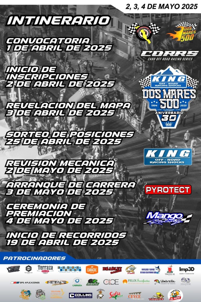 La Dos Mares 500 – 2025 se llevará a cabo este mes de mayo 2,3 y 4, con salida y meta en La Paz, recorriendo un desafiante circuito de más de 500 kilómetros por caminos, brechas y terrenos extremos del corazón del estado. Prepárate para vibrar con el rugido de los motores y el entusiasmo de las familias que hacen de este evento toda una fiesta regional.