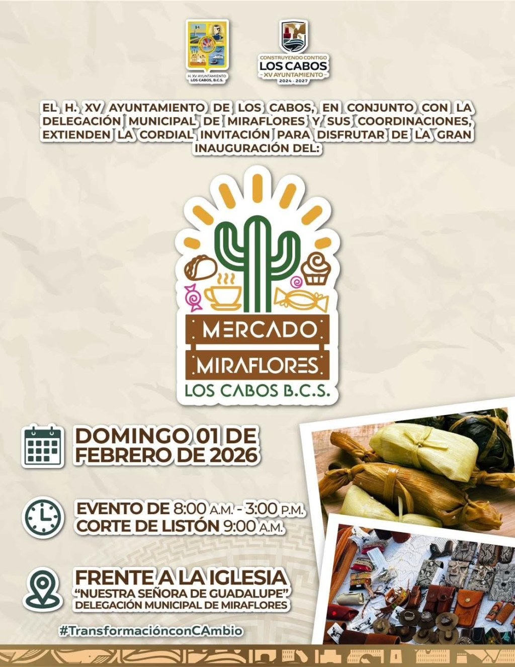 Los Cabos, Baja California Sur, a 28 de enero de 2026.– El XV Ayuntamiento de Los Cabos, en coordinación con la Delegación Municipal de Miraflores y la Coordinación de Fomento Económico, extiende la invitación a la ciudadanía y visitantes a la gran inauguración del “Mercado Miraflores”, un nuevo espacio creado para impulsar la economía local y visibilizar la riqueza productiva de la zona rural del municipio.