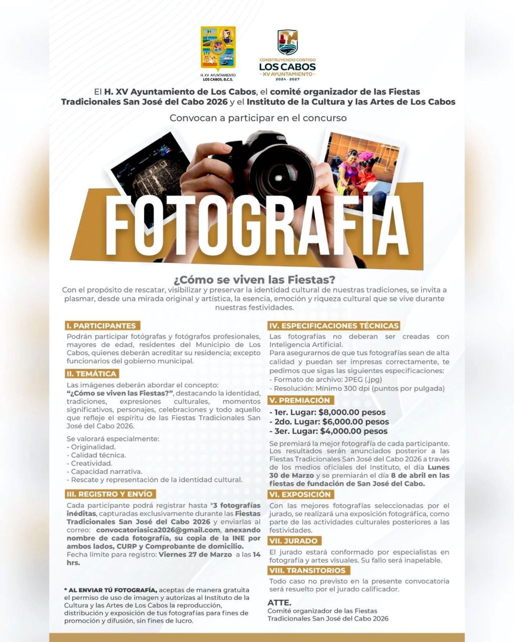 Los Cabos, Baja California Sur.– El XV Ayuntamiento de Los Cabos, a través del Instituto de la Cultura y las Artes (ICA) y el Comité Organizador de las Fiestas Tradicionales San José del Cabo 2026, lanzó la convocatoria para el concurso de fotografía con la temática “¿Cómo se viven las Fiestas?”.
