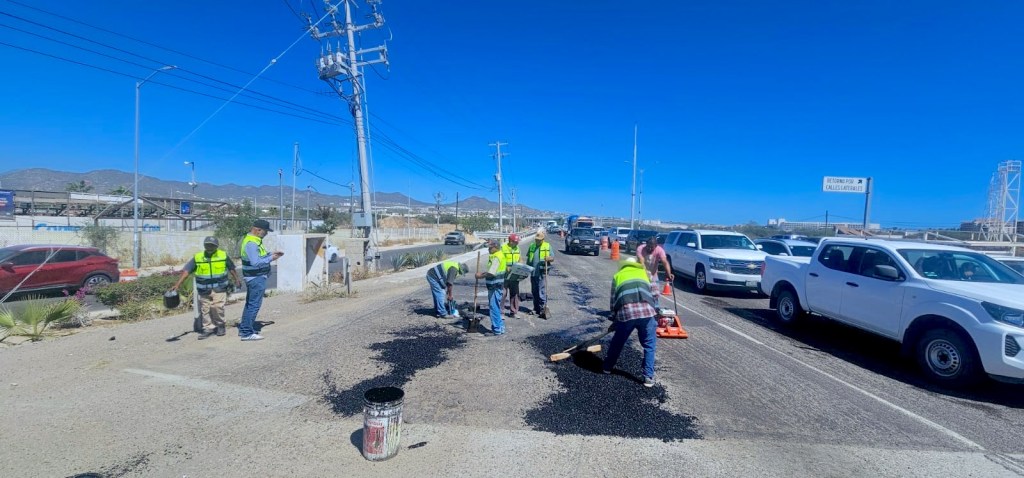 Los Cabos, Baja California Sur.– El XV Ayuntamiento de Los Cabos continúa con las acciones del programa permanente “Caza Baches” en Cabo San Lucas, realizando trabajos de mantenimiento sobre la carretera Transpeninsular, específicamente a la altura de La Sanluqueña, uno de los tramos con mayor circulación vehicular.