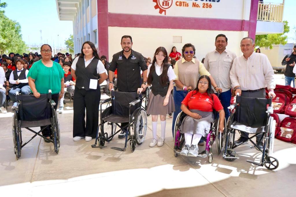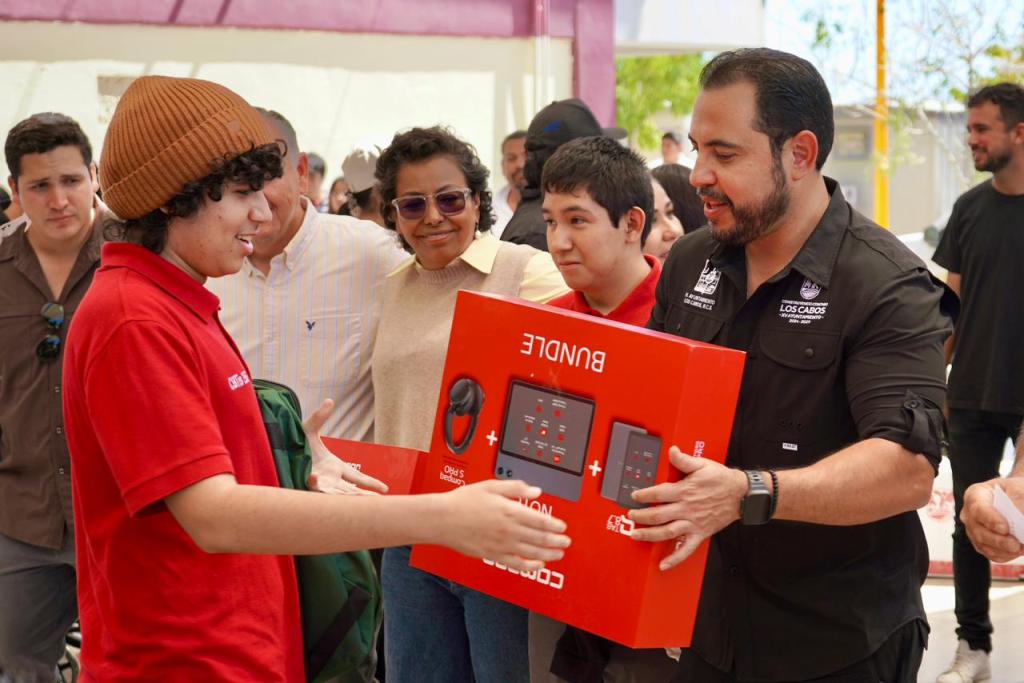 Los Cabos, Baja California Sur.– Con el objetivo de fortalecer las condiciones educativas y brindar apoyos directos a la comunidad estudiantil, el presidente municipal Christian Agúndez Gómez encabezó la entrega de 1,100 mochilas escolares, 35 tablets para estudiantes con alto rendimiento académico y sillas de ruedas durante una visita al Centro de Bachillerato Tecnológico, Industrial y de Servicios (CBTIS) No. 256.