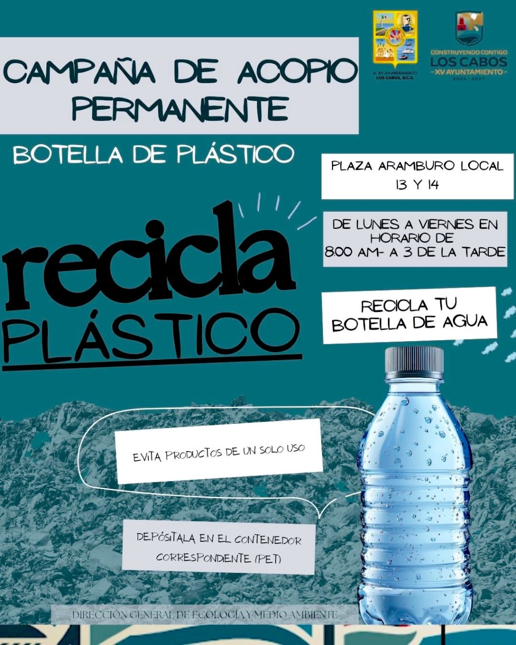 Los Cabos, Baja California Sur.– Con el objetivo de fortalecer la cultura del reciclaje y mejorar la gestión de residuos en el municipio, el XV Ayuntamiento de Los Cabos, a través de la Dirección General de Ecología y Medio Ambiente, mantiene una campaña permanente de acopio de plástico PET para facilitar su correcta disposición y evitar que termine contaminando calles, arroyos o ecosistemas marinos.