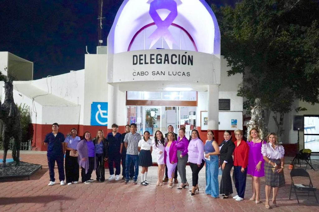 Los Cabos, Baja California Sur.– En el marco de las actividades conmemorativas por el Día Internacional de la Mujer, el Instituto de las Mujeres del Municipio de Los Cabos, a través de su coordinación delegacional en Cabo San Lucas, realizó el encendido del lazo morado en el edificio delegacional, como símbolo de la lucha por la igualdad, el respeto y la defensa de los derechos de las mujeres.