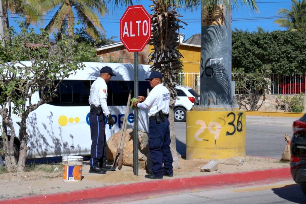 Los Cabos, Baja California Sur.– El XV Ayuntamiento de Los Cabos, a través de la Dirección General de Seguridad Pública, Policía Preventiva y Tránsito Municipal, inició un programa de instalación de señalética vial en las vialidades con mayor flujo vehicular del municipio.
