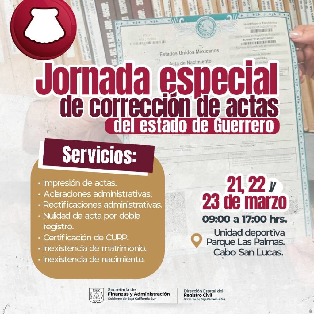 Los Cabos, Baja California Sur.– La Dirección Municipal del Registro Civil de Los Cabos informó que las personas originarias del estado de Guerrero que radican en el municipio podrán acceder a la Jornada Especial de Corrección de Actas, la cual se realizará los días 21, 22 y 23 de marzo en la Unidad Deportiva del Parque Las Palmas, en Cabo San Lucas, en un horario de 09:00 a 17:00 horas.
