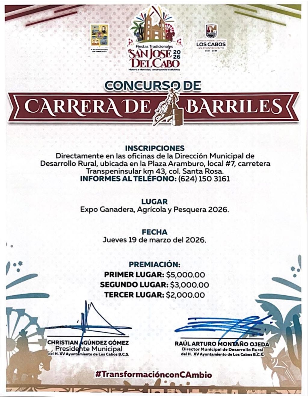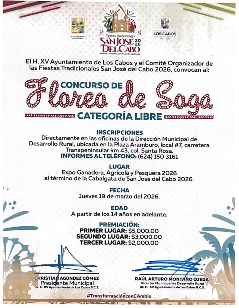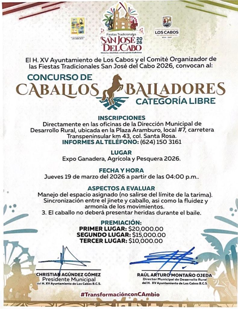 Los Cabos, Baja California Sur.– El XV Ayuntamiento de Los Cabos, a través de la Dirección Municipal de Desarrollo Rural y en coordinación con el Comité Organizador de las Fiestas Tradicionales San José del Cabo 2026, invitó a la ciudadanía a participar en las disciplinas ecuestres que se desarrollarán el próximo jueves 19 de marzo en el marco de la Expo Ganadera, Agrícola y Pesquera 2026.