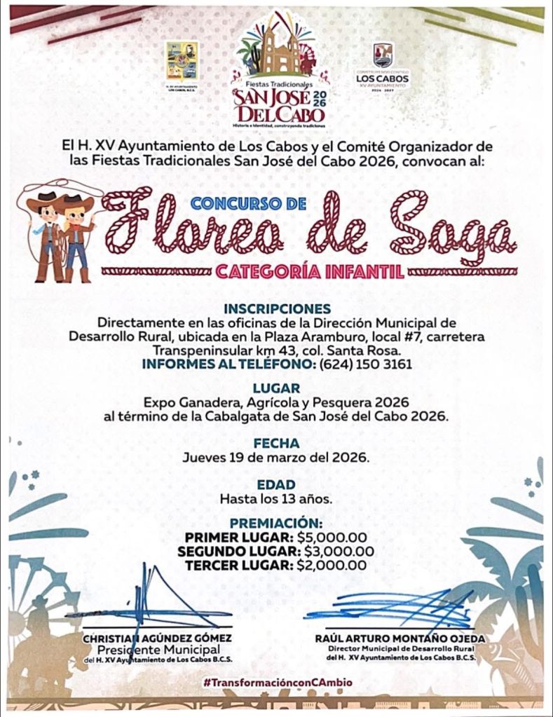 La jornada iniciará al término de la tradicional Cabalgata de San José del Cabo 2026 y contempla concursos de Floreo de Soga en categorías Infantil y Libre, así como la Carrera de Barriles. Además, uno de los eventos principales será el Concurso de Caballos Bailadores en categoría Libre, programado a partir de las 16:00 horas en el recinto de la Expo Ganadera.