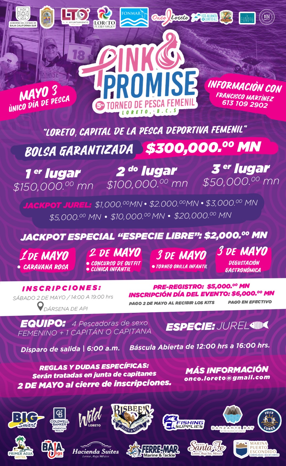 El pre-registro puede realizarse en el sitio https://pinkpromise.mx/pre-inscripcion/ con un costo de 5 mil pesos; el registro el día del evento será en la dársena de API con un costo de 6 mil pesos. Los equipos deberán estar integrados por cuatro pescadoras y un capitán.
