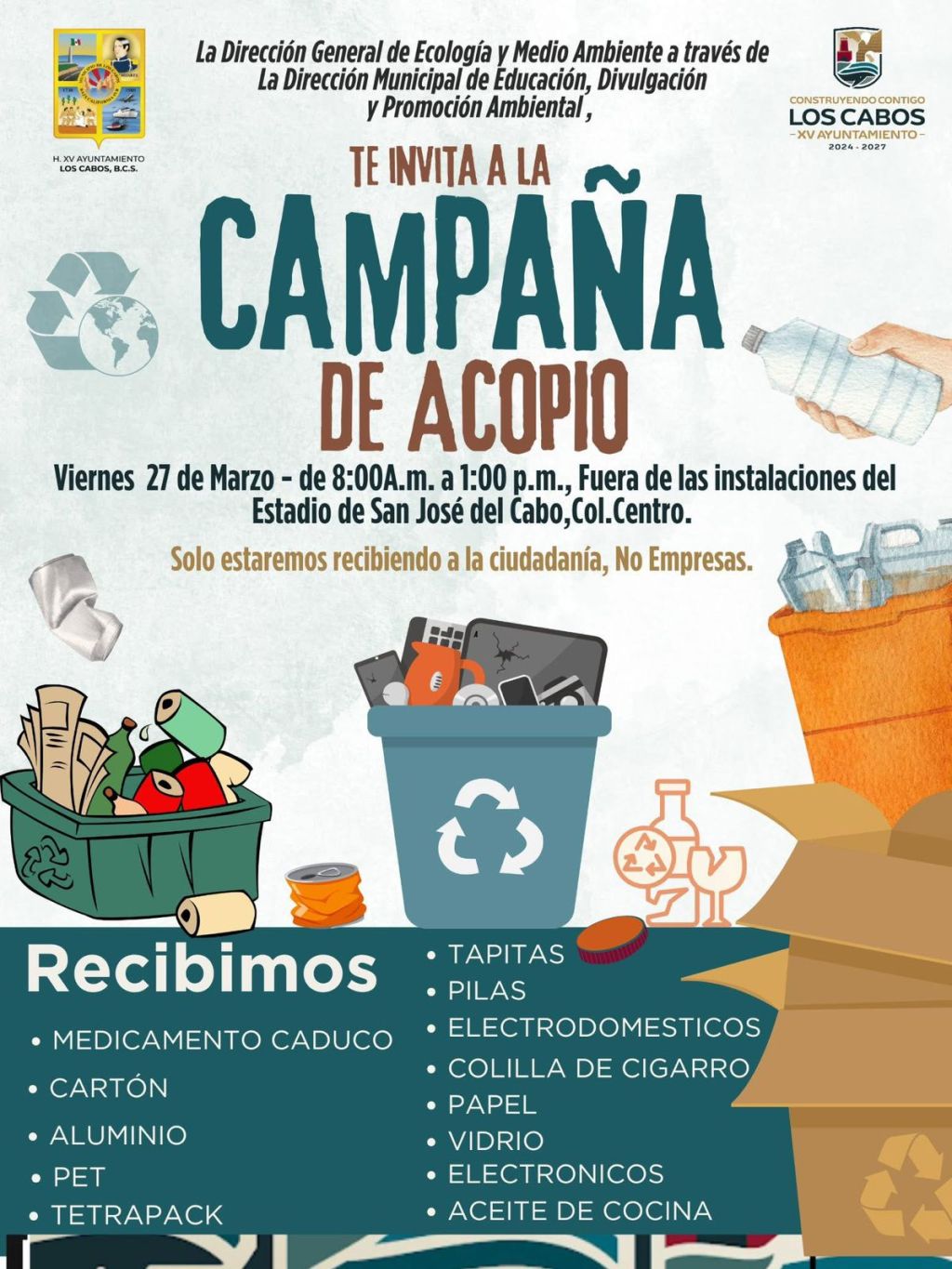 Los Cabos, Baja California Sur.– La Dirección General de Ecología y Medio Ambiente invita a la ciudadanía a participar en la jornada de acopio de materiales reciclables, que se llevará a cabo este viernes 27 de marzo en San José del Cabo.