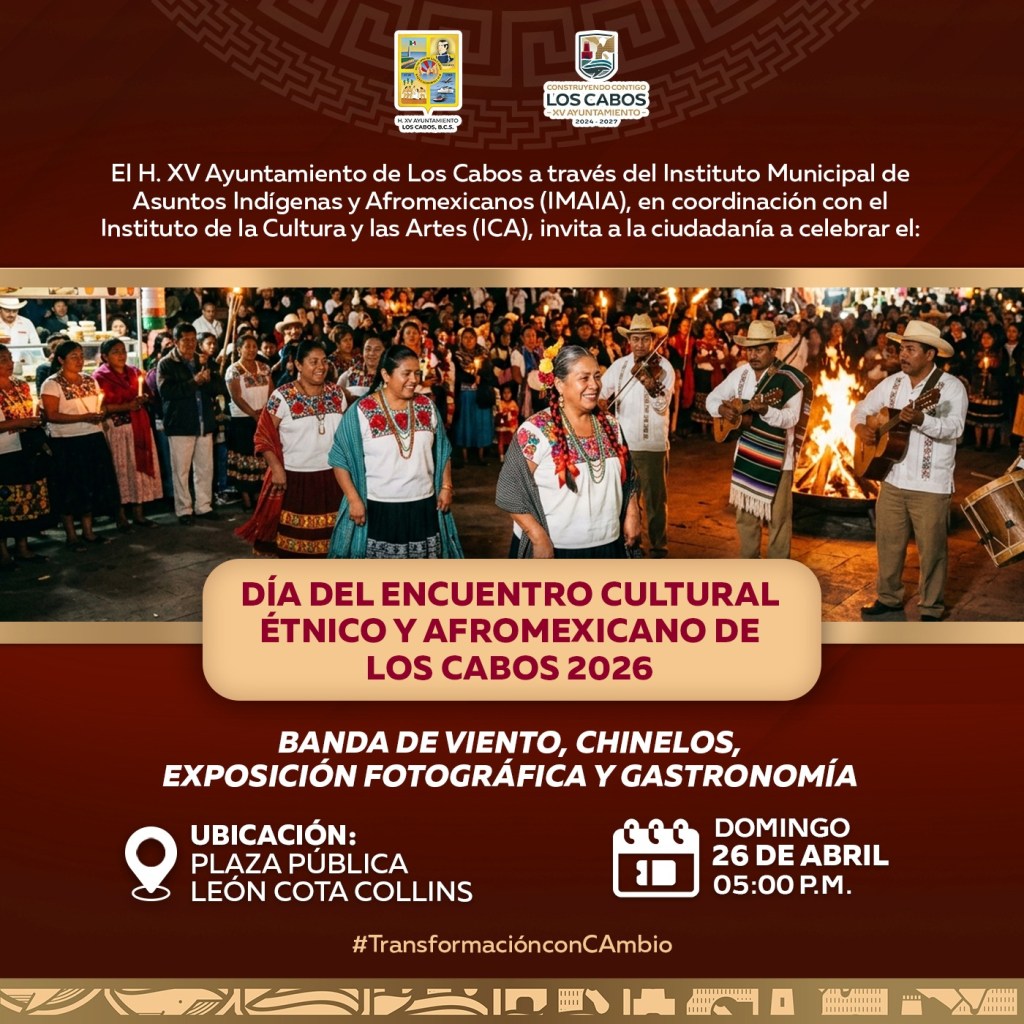 Los Cabos, Baja California Sur.– El XV Ayuntamiento de Los Cabos invita a la ciudadanía a participar en el “Día del Encuentro Cultural Étnico y Afromexicano de Los Cabos 2026”, una celebración de la diversidad cultural del municipio.