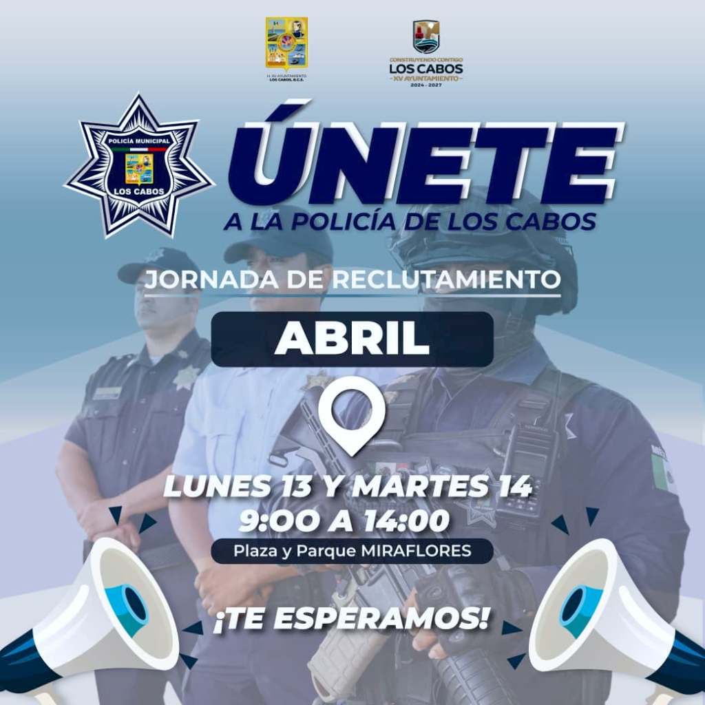 Resumen: Invitan a jornada de reclutamiento de Policía Municipal en Miraflores el 13 y 14 de abril, para fortalecer la seguridad en Los Cabos.