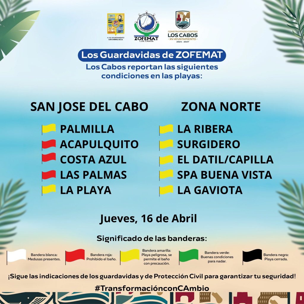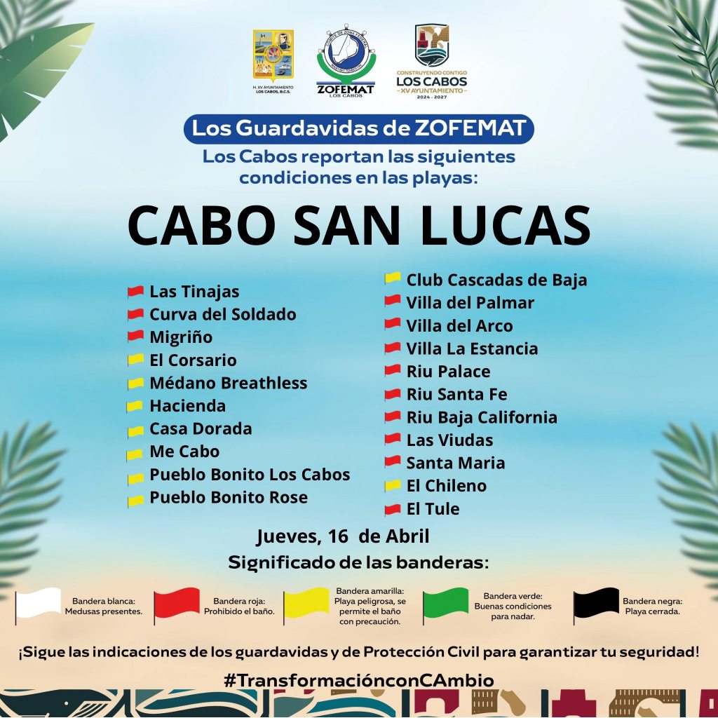 Resumen: Autoridades refuerzan la vigilancia y el sistema de banderas en playas de Los Cabos para prevenir riesgos y proteger a los visitantes.