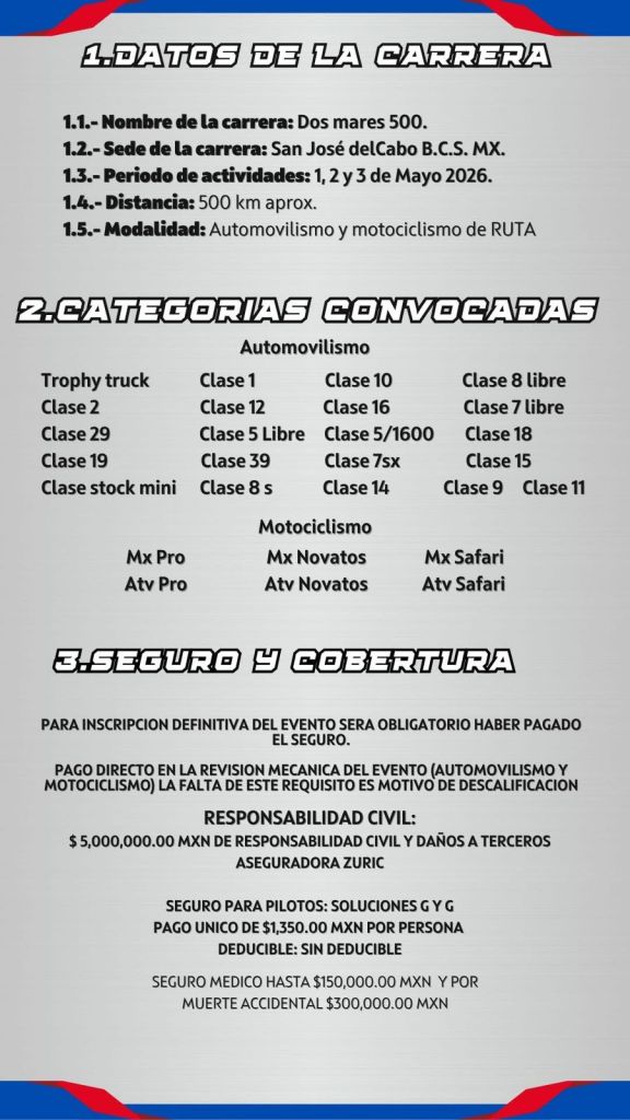 El banderazo de salida será a las 12:00 horas en la zona hotelera de San José del Cabo con la categoría de motociclismo, mientras que los vehículos iniciarán a las 16:00 horas.