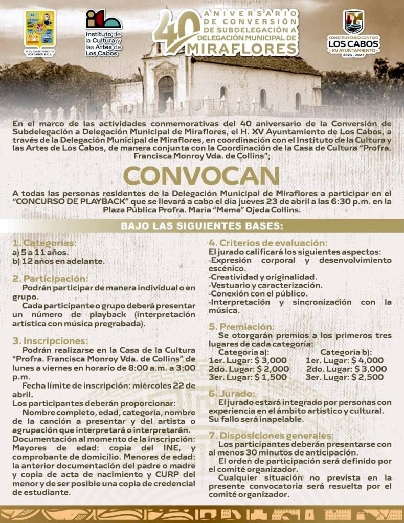 Resumen: Los Cabos invita a celebrar el 40 aniversario de Miraflores con actividades culturales, concursos y exposiciones el 23 y 24 de abril.