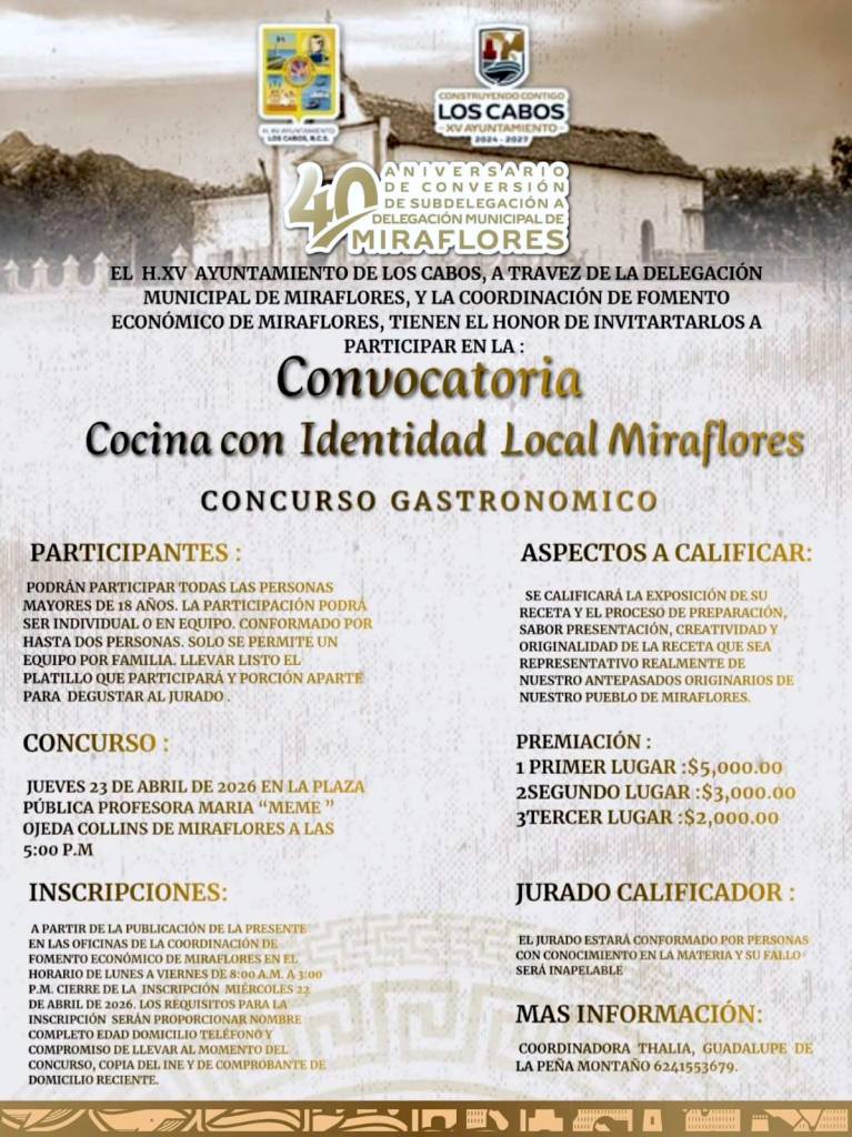 Los Cabos, Baja California Sur.– El XV Ayuntamiento de Los Cabos invita a la ciudadanía a participar en las actividades conmemorativas por el 40º aniversario de Miraflores como delegación municipal.