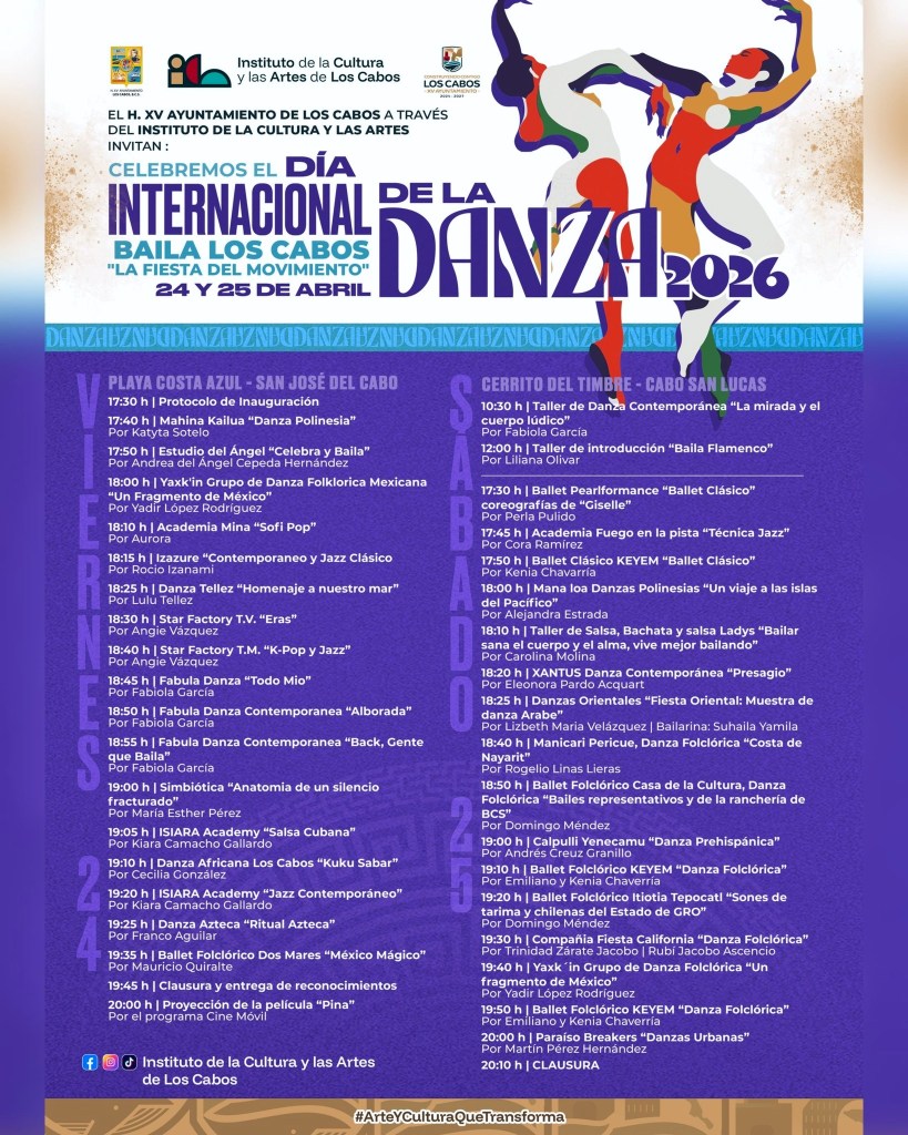 Los Cabos, Baja California Sur.– El XV Ayuntamiento de Los Cabos, a través del Instituto de la Cultura y las Artes (ICA), invita a la ciudadanía a “Baila Los Cabos: La Fiesta en Movimiento”, en el marco del Día Internacional de la Danza.