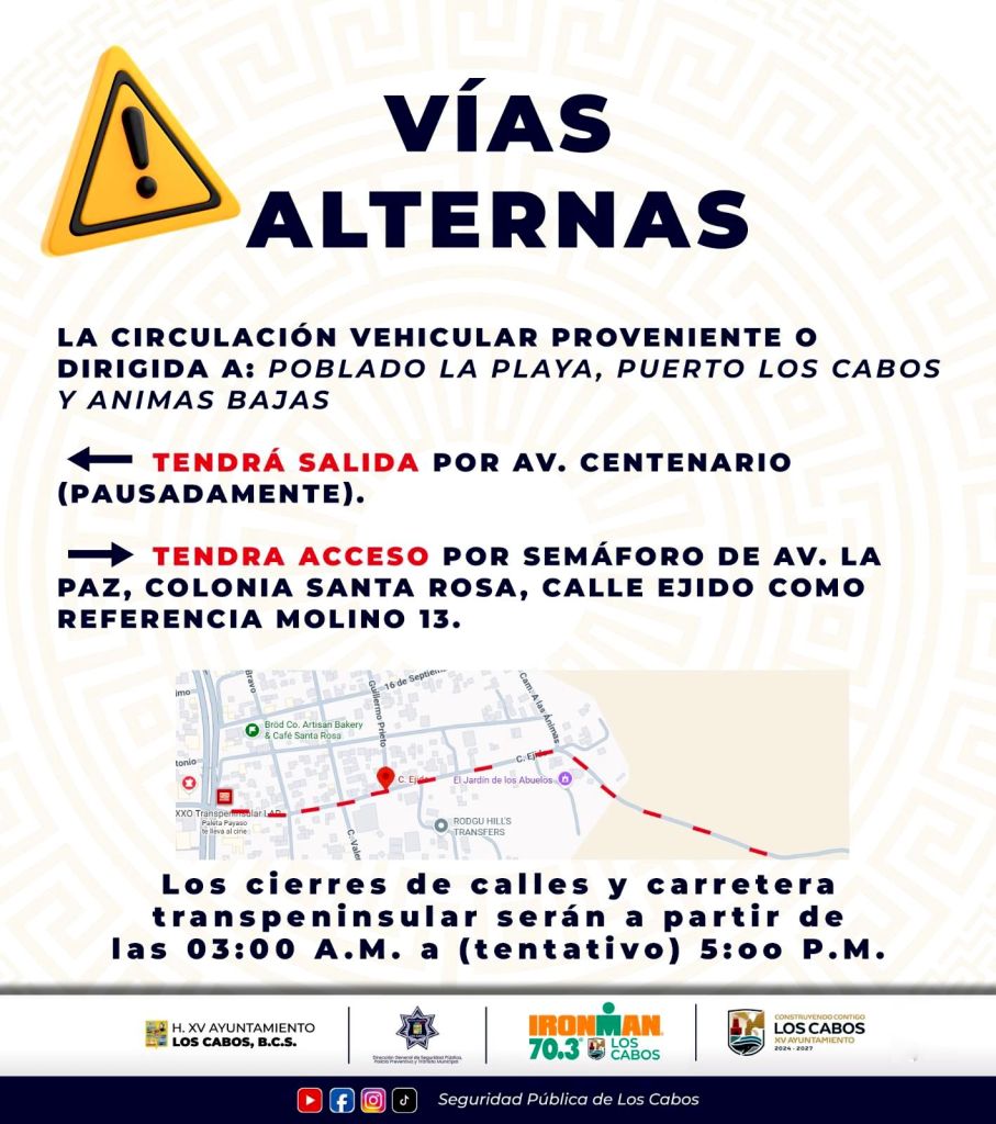 Los Cabos, Baja California Sur.– El Ayuntamiento informó sobre cierres viales temporales por el Ironman 70.3 que se realizará este domingo 26 de abril.
