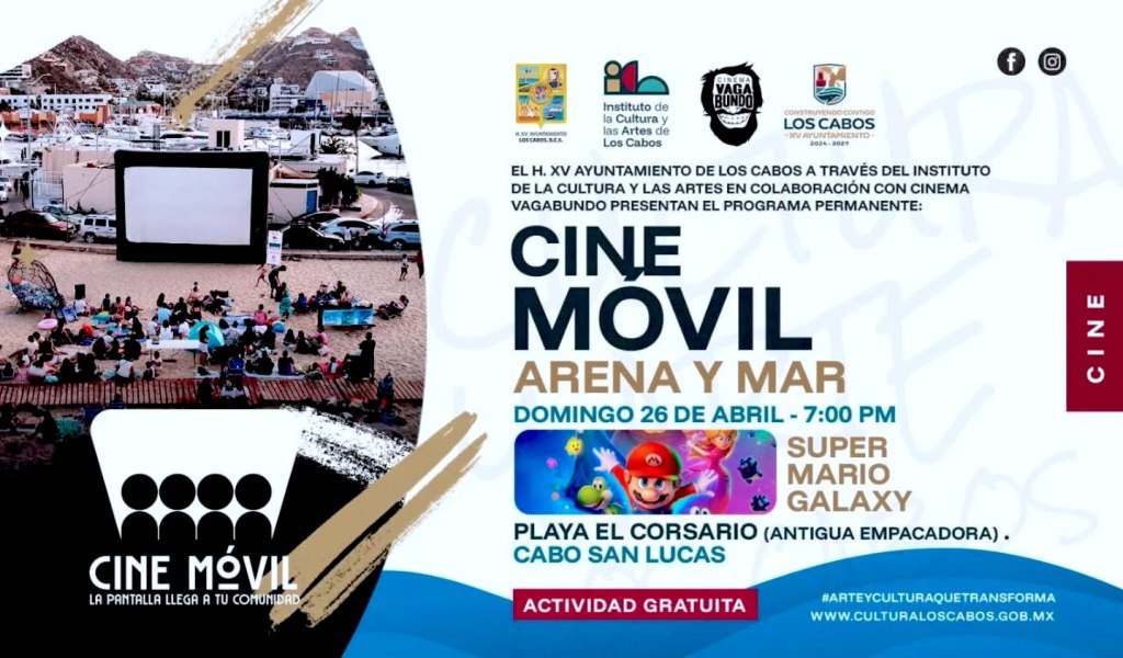 Los Cabos, Baja California Sur.– El Ayuntamiento de Los Cabos invita a disfrutar de una función gratuita del programa “Cine Móvil: Arena y Mar” este 26 de abril.